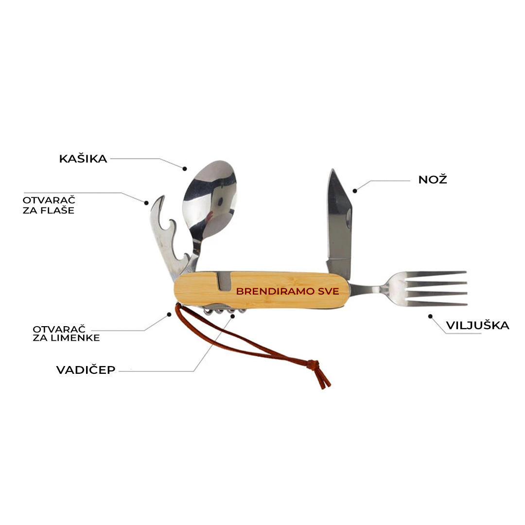 Zahvaljujući 6 korisnih funkcija – kašika, otvarač za flaše, razvijač, otvarač za vino, viljuška i nož – ovu alatku korisnik ima uz sebe u gotovo svakoj prilici. Ako tražite promotivni proizvod koji istovremeno izgleda premium i dodaje vrednost korisničkom iskustvu ovo je pravi izbor.