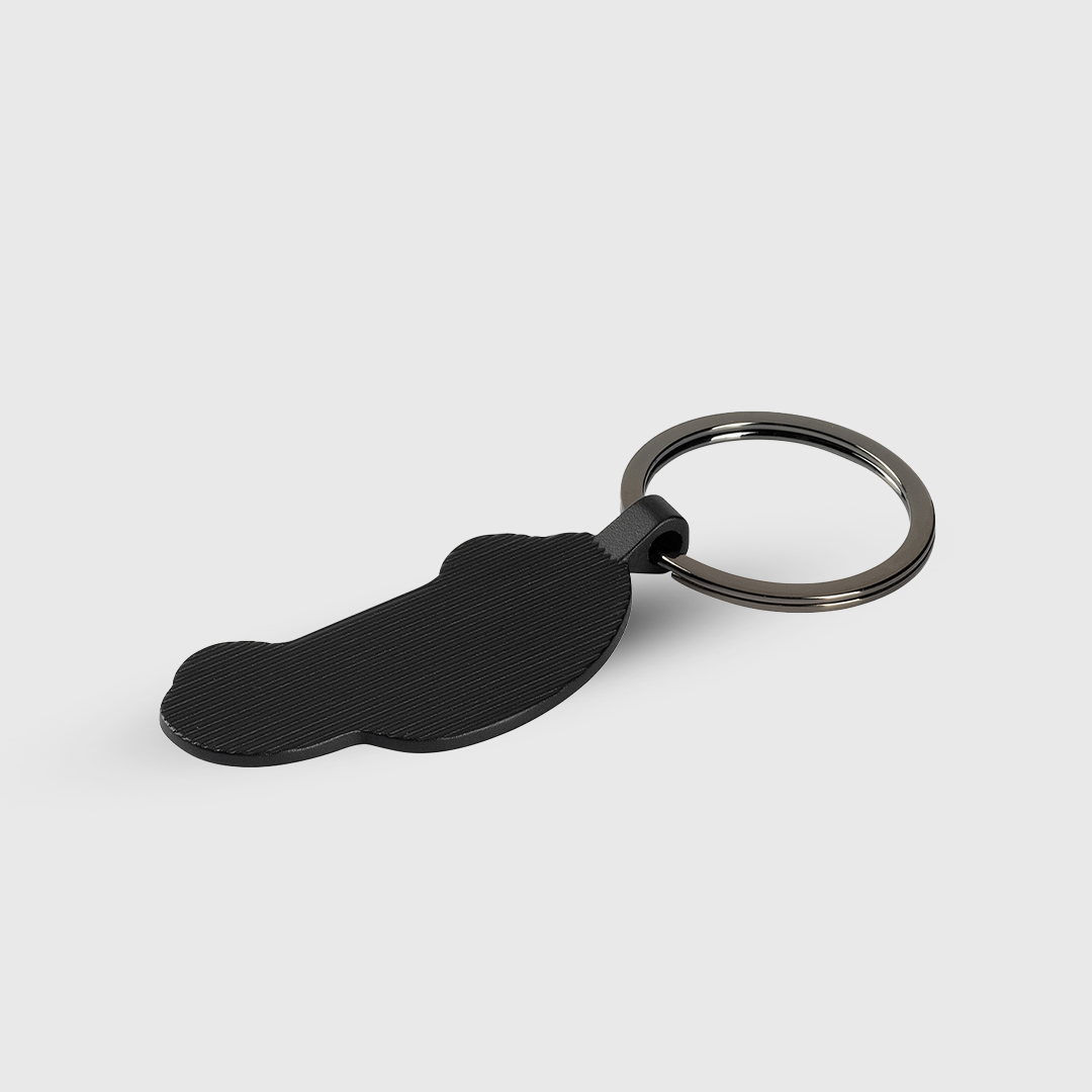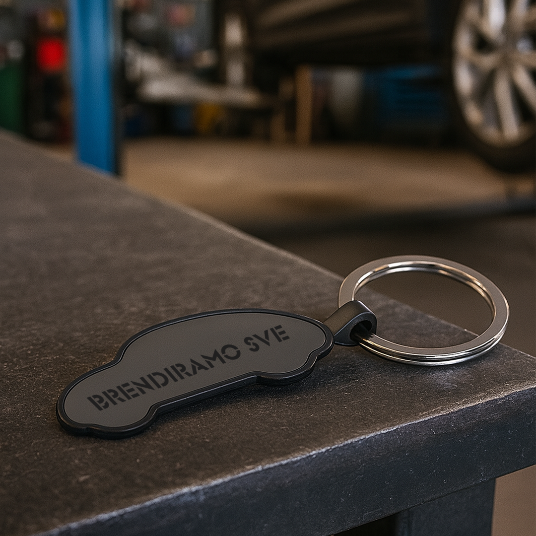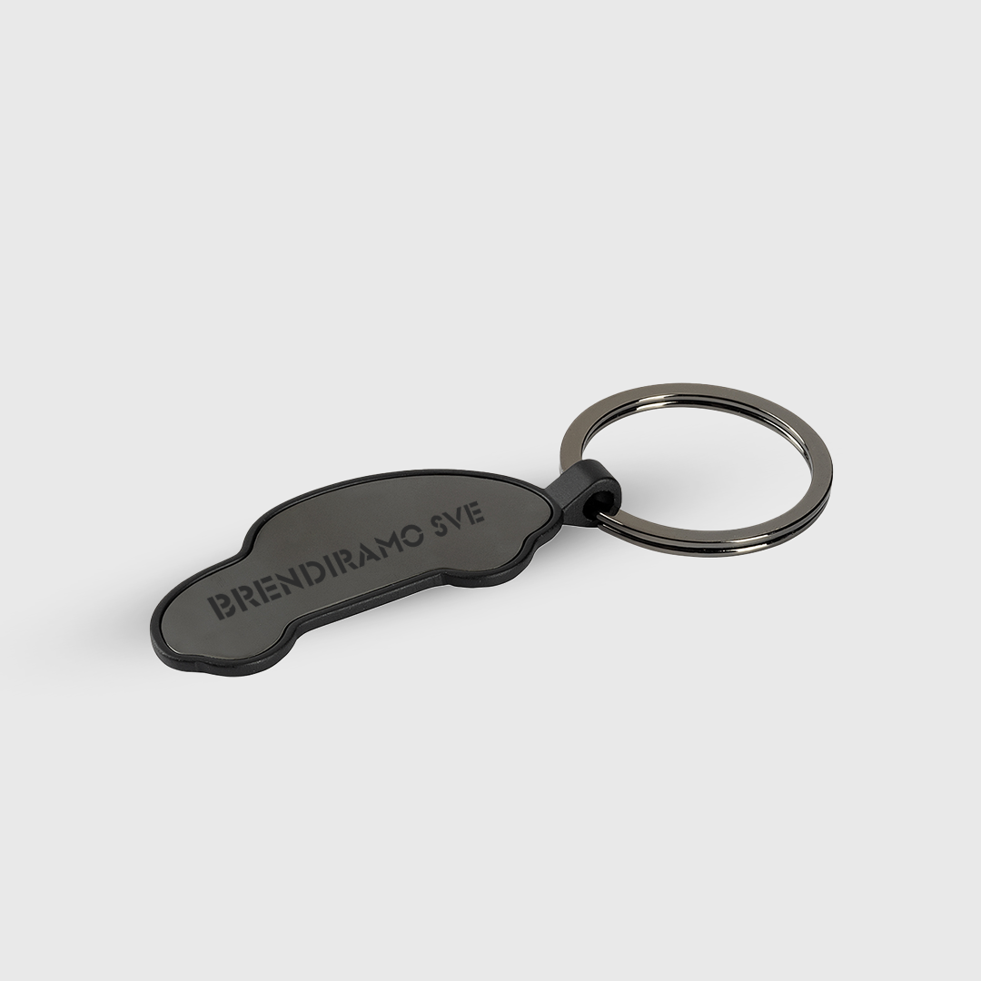 Metalni privezak za ključeve visoke završne obrade u boji Gun, dimenzija 5,5 × 2,8 cm. Dizajniran za brendiranje putem laserske gravure, pruža sofisticirani i trajni imidž vašeg logotipa direktno na metalnoj površini.